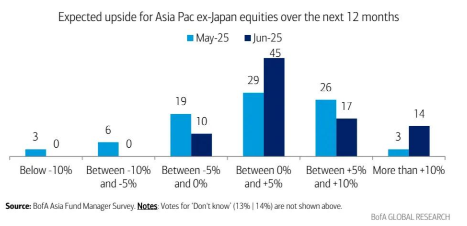 目前,净 46% 的投资者预计全球经济将走弱,这与 4 月份 82% 的比例相比有了显著改善;而净 45% 的投资者预计亚洲经济将走弱,较 4 月份 89% 的比例也有所进步。